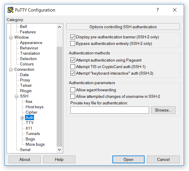 Step 2: Choose SSH -> Auth from category list. Here you need to add your “.ppk” private key. Then click open.